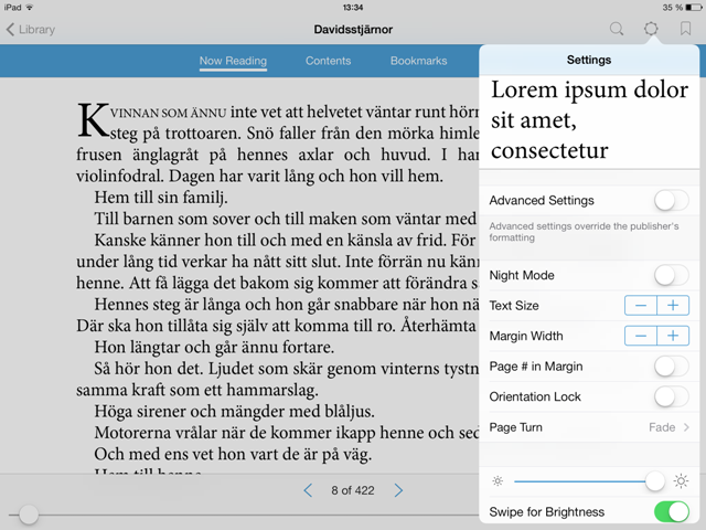 I samband med att en bok öppnas i appen finns information om den aktuella boken samt en översikt över bokens kapitel. Under ”inställningar” finns olika funktioner som ljusstyrka, textstorlek, bakgrundsfärg, typsnitt, textfärg, nattbelysning och sidnummervisning. Du kan också söka ord och namn i boken genom att använda search-funktionen. Bluefire Reader visar då alla sidor där det specifika sökordet finns med och du slussas vidare till den sida du letar efter.