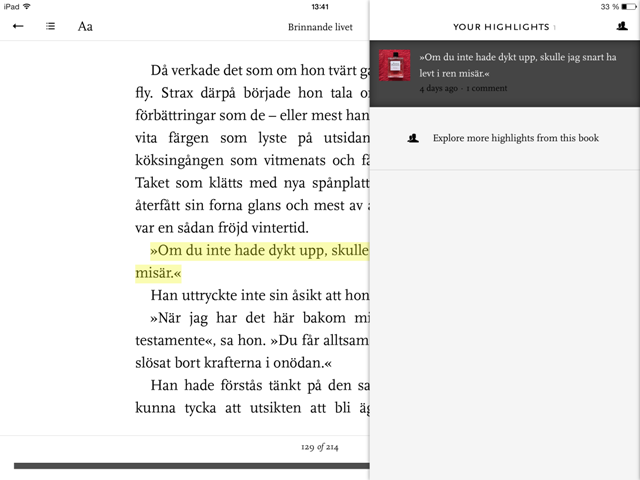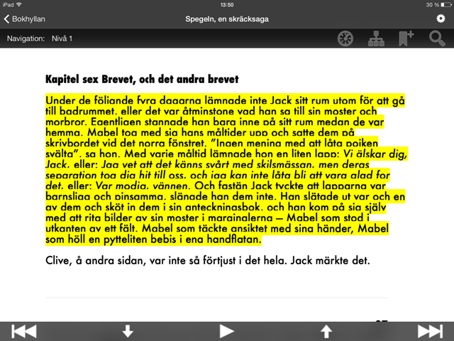 Det går att stryka över text genom att markera den och sedan välja ”highlight”, då markeras texten med överstrykningspenna och sparas i ”Bookmarks”. Vill du skriva en anteckning markerar du texten igen och väljer ”note”. Anteckningarna går att redigera under ”Bookmarks”.